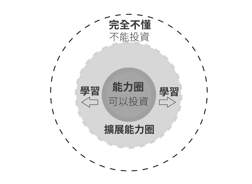巴菲特強調要在「能力圈」以內投資股票,也就是「你只能投資自己了解的公司,如果你沒辦法理解,那就不要去投資。」能力圈的重點並不是你懂多少,而是你「不懂什麼」。現在的資訊氾濫,每一支股票在媒體渲染之後,看起來都非常誘人,但是如果你不懂這家公司,上漲的時候你會煩惱「要不要獲利了結」,下跌的時候也會煩惱「要不要停損賣出」,整個投資決策有如盲人騎瞎馬,最後就是賠錢更賠上心情。