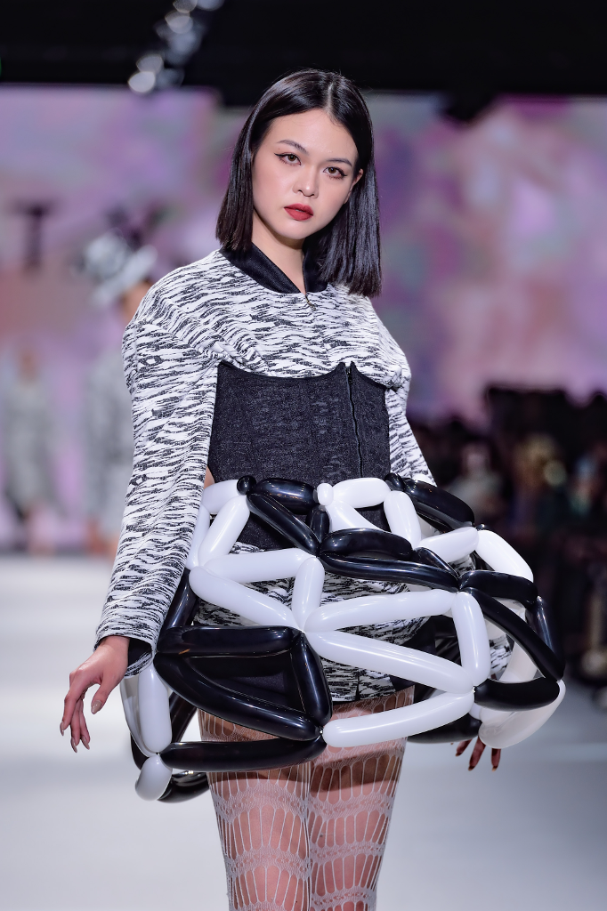 展演當天,由伊林模特兒演繹洪璽皓製作的氣球飾品,