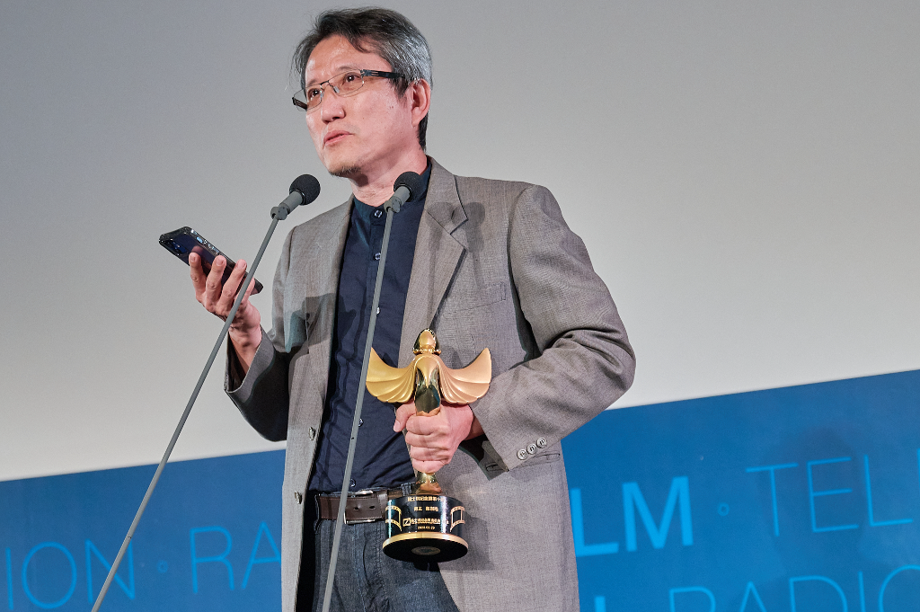 ▲ 獲頒「楊士琪紀念獎」的紀錄片《九槍》導演蔡崇隆致詞感性發言,哽咽說出「我以身為台灣的創作者為榮!」引來全場掌聲。(圖:國家影視聽中心提供)