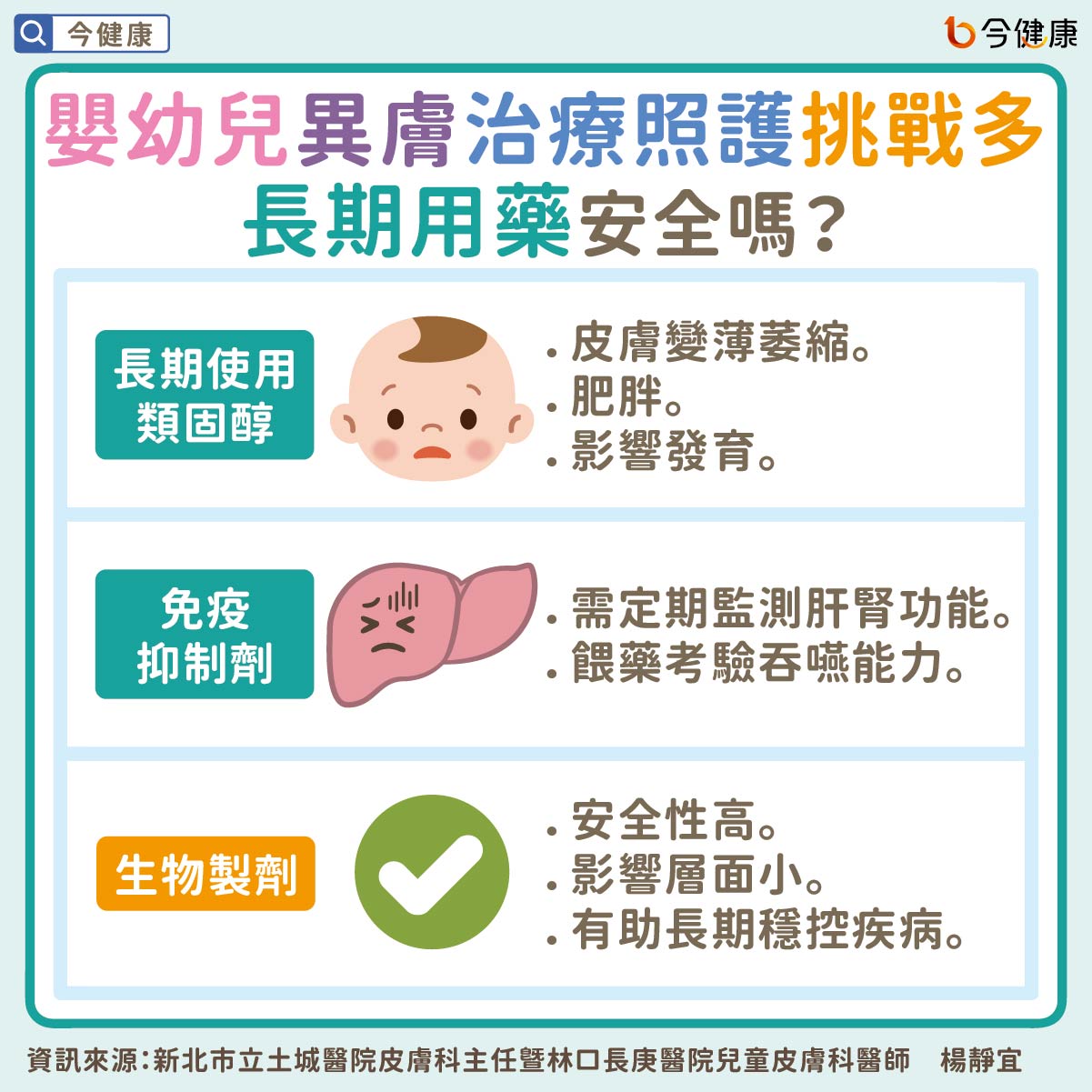 新北市立土城醫院皮膚科主任暨林口長庚醫院兒童皮膚科醫師楊靜宜進一步說明,目前臨床針對嬰幼兒異膚,會依據嚴重程度而給予不同強度藥物,但嬰幼兒發育尚在起步階段,長期使用類固醇容易有皮膚變薄萎縮、肥胖、影響發育等副作用,經常使用免疫抑制劑需定期監測肝腎功能,就連餵藥,也需要考驗寶寶的吞嚥能力。