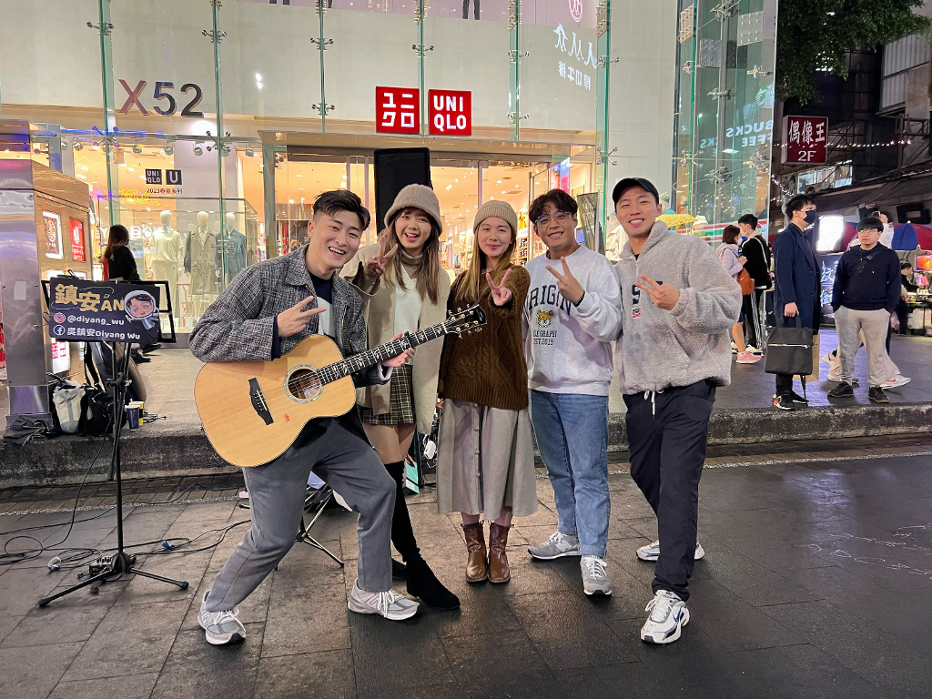 ▲ 香港鬼王潘紹聰(中)與街頭藝人鎮安(左)、蘇侯宇(右)在街頭進行張國榮歌曲演唱快閃活動。(圖:Big Big Air Asia & 香港環球音樂)