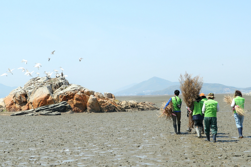 ▲ 南韓觀察到黑面琵鷺聚集的築巢行為,便以人工方式提供巢材。(圖:采昌)