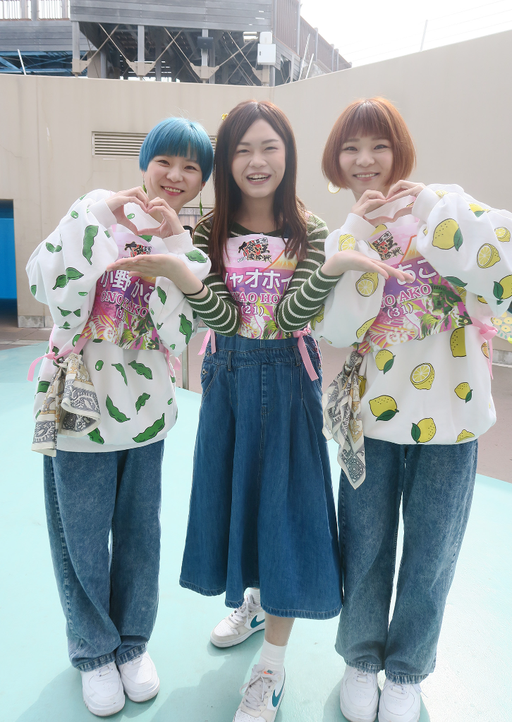 ▲台灣大胃王小慧(中)與日本大胃王雙胞胎小野姊妹,姊姊「佳子」(左)、妹妹「亞子」(右)。(圖:緯來綜合台)