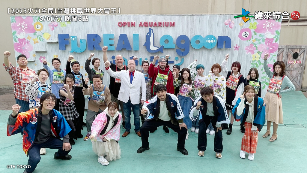 ▲《2023火力全開大胃王世界大賽》合照:第一排(左起)巨人白田、主持人高橋南、助理主持アルコ&ピース、パンサー、來賓稻村亞美。(圖:緯來綜合台)