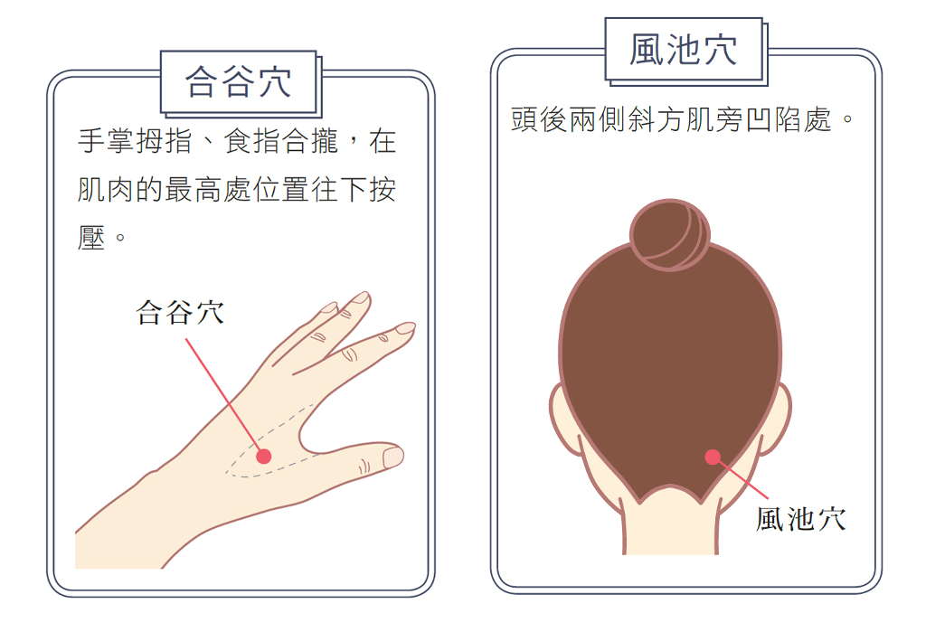 用手指按壓合谷穴與風池穴,可達到疏散風邪之效。