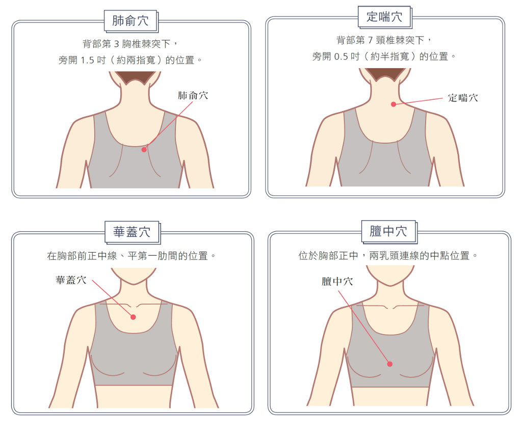 ▲ 肺俞穴、定喘穴、華蓋穴、膻中穴。(圖:創意市集)