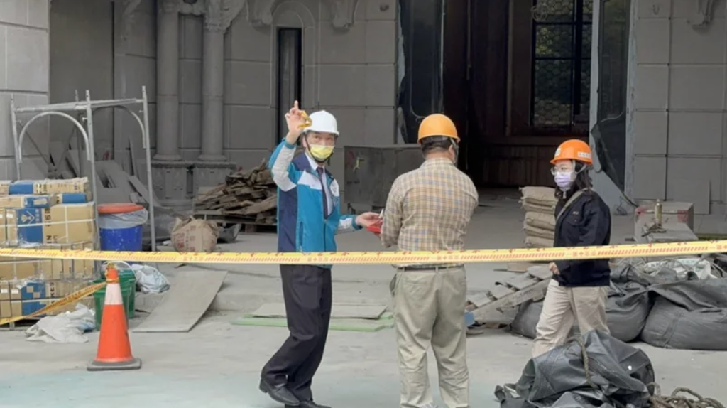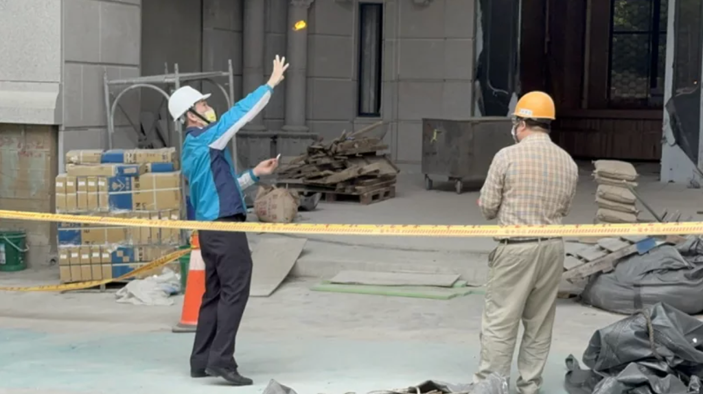建案大門前堆滿昨砸落的40公尺鋼架,被切割成數段擺放鐵柵欄內,上午11點多有2名頭戴安全帽疑似風水師,一人持羅盤,一人則對內外勘驗後,隨即燃燒符紙開始比畫作法,並隨其餘工作人員進入建案內部。