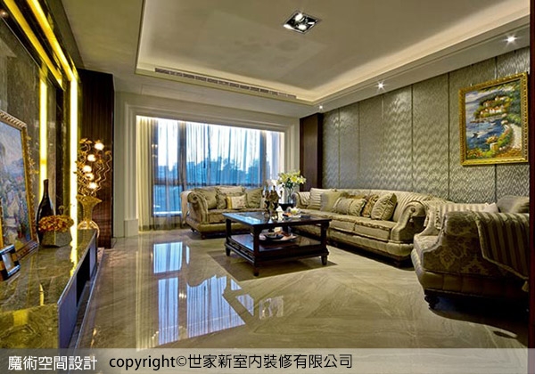 1. 客廳古典大器,地坪採用無縫處理施作工法,突顯大理石細緻紋理,沙發背牆精裱壁紙,展現閃亮律動。
