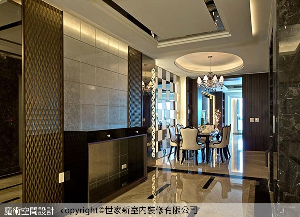 4.【圖說】梯廳玄關端景,林垚豐總監以對稱式皮革壓菱格紋,烘托銀箔鑲貼立面,藉由材質鋪敘低奢語彙。