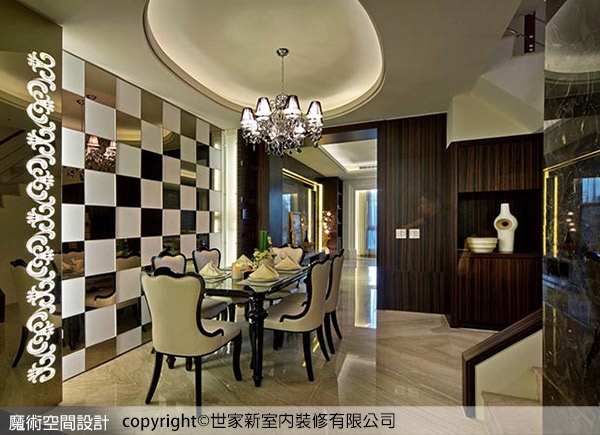 5.【圖說】世家新室內設計於餐廳主牆,運用白色烤漆與茶玻交錯編織意象,在延伸空間景深的同時亦活潑敘餐氣氛。
