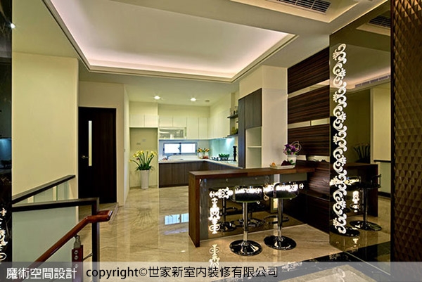 3. 餐廳主牆運用白色烤漆與茶玻交錯編織意象,活潑敘餐氣氛,開放式廚房搭配吧檯,沉穩色調中藉茶玻雕花呼應餐廳亮麗圖騰。