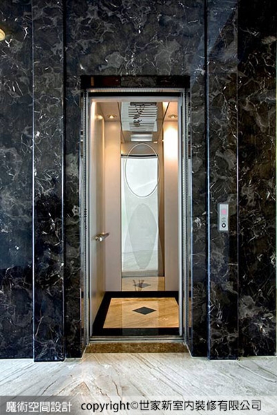 4. 林垚豐總監為體貼長輩及長遠未來所規劃的電梯,外表透過大理石立柱強化氣勢,內裝則以造型鏡面、拼花地板共譜精緻度。