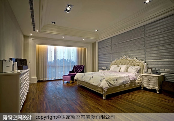10.【圖說】敞朗主臥以銀色皮革繃布柔化床頭背板,巨幅尺度讓空間更顯大器。