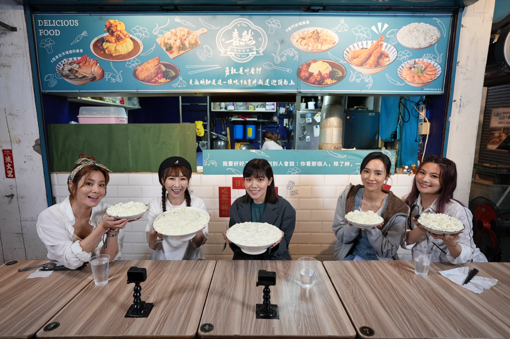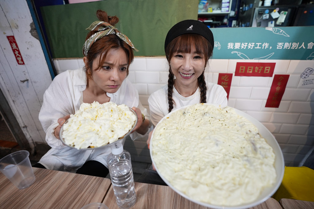 ▲ 主持人莎莎、大胃王艾嘉,挑戰2.6公斤雲朵咖哩炒烏龍。(圖:緯來綜合台)