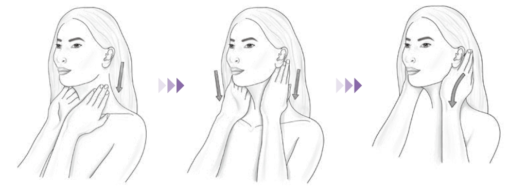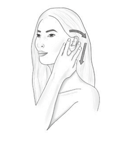 雙手置於耳後,小指放在軟骨凹槽處。掌根以畫C 的方式輕柔地往下滑動。重複10 次。