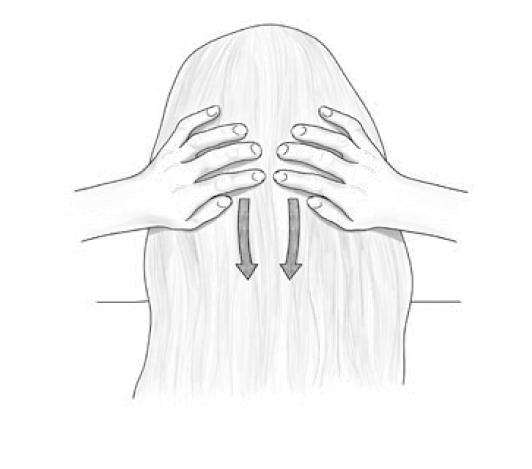 雙手指尖置於顱骨底部,緊鄰「枕骨脊」。接著用瀑布從山頭流下那樣的形勢,將指尖由枕骨脊順著脖子輕柔地往下滑動。重複10 次。