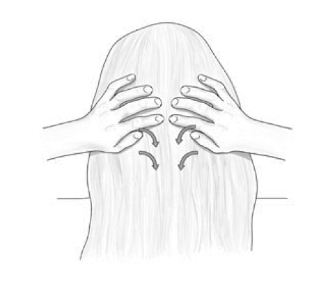 用指尖按摩整個頭皮,就像洗頭那樣。由頭皮的前側一路按到後側,再往下按到頸部後側,以活絡腦中的膠淋巴系統。按摩期間,你可以把你的腦袋想像成一顆乾淨、明亮的發光體。