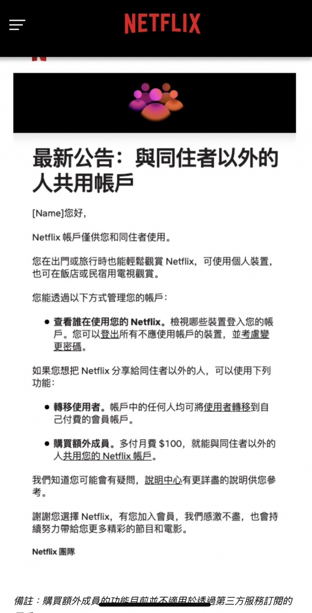 只見公告中顯示,即日起,官方將會陸續向在台灣與非同住者共用Netflix帳戶的會員寄送信件,同時宣布兩項方案,若想把Neflix分享給同住者以外的人,第一、「轉移使用者」:帳戶中的任何人均可將使用者轉移到自己付費的會員帳戶。第二、「購買額外成員」,多付月費100元,即可與同住者以外的人共用您的Netflix帳戶。