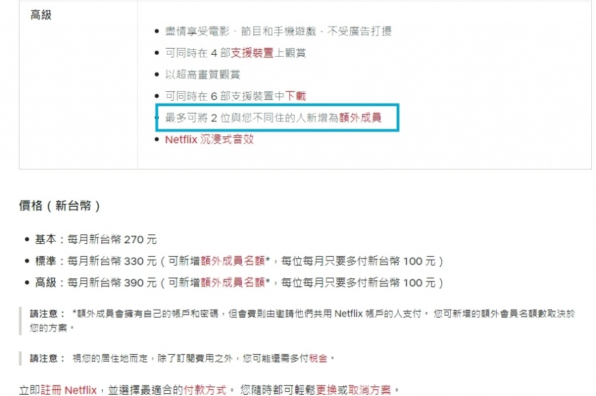 不過,仔細看官方說明中心的方案說明,標準方案(每月新台幣330元),可同時在2部支援裝置上觀賞,可將1位與您不同住的人新增為額外成員,每位每月只要多付新台幣100元;高級方案(每月新台幣390元),可同時在4部支援裝置上觀賞,最多可將2位與您不同住的人新增為額外成員,每位每月只要多付新台幣100元。
