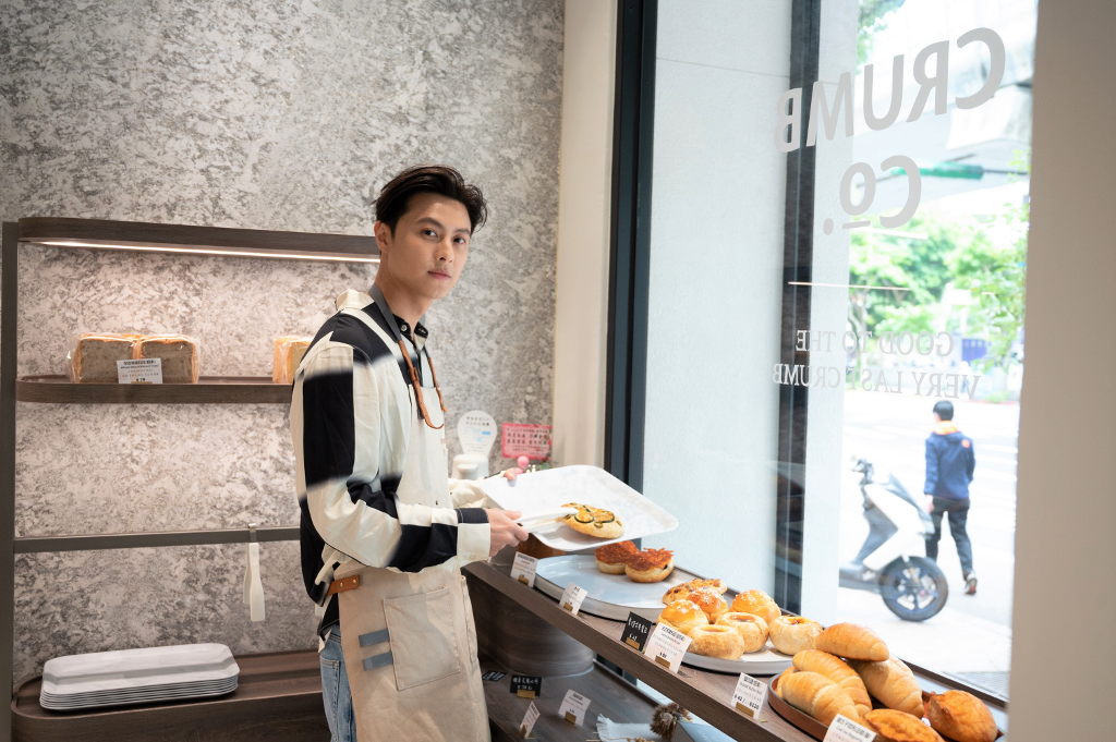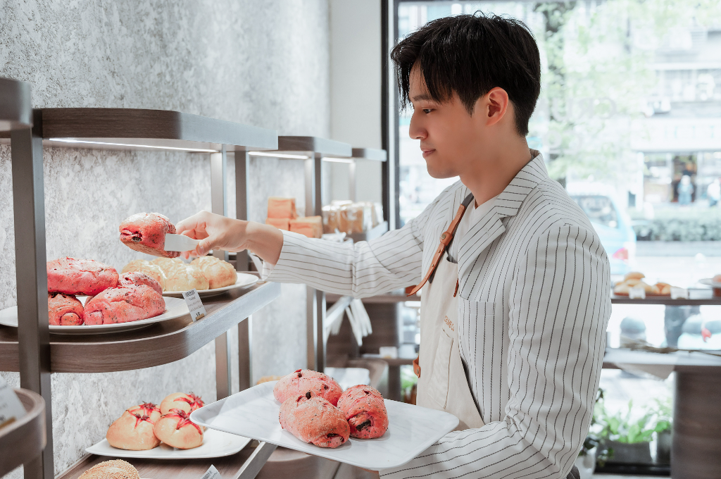 ▲ 邱勝翊擔任一日店長將麵包上架。(圖:艾迪昇傳播)