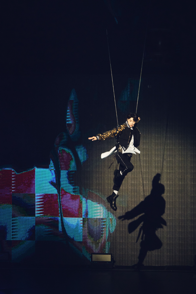 ▲ 「Ozone」文廷將吊鋼絲結合了擊鼓、武術和舞蹈的才華,從超過四公尺的高度帥氣飛身而下。(圖:索尼音樂)