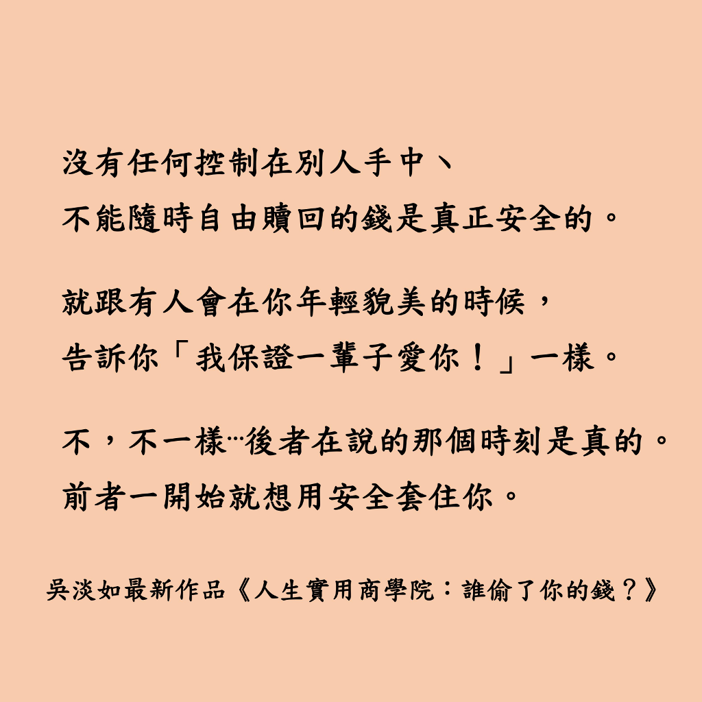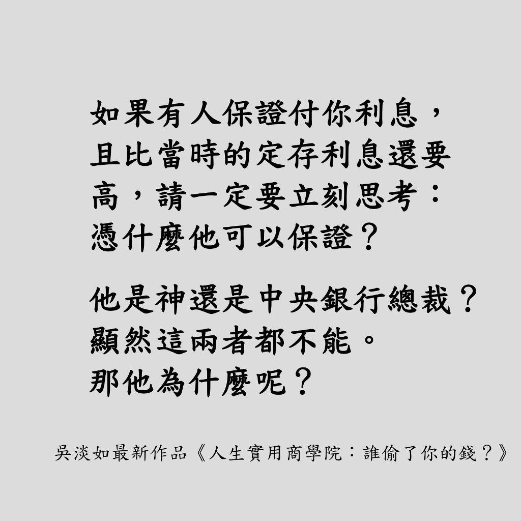 就跟有人會在你年輕貌美的時候,告訴你說,「我保證一輩子愛你!」一樣。感情,有時候也有異曲同工之妙!你可以……先深呼吸,明白理想未必是現實嗎?無論如何,千萬不要因為聽到「保證獲益」、「絕對償還本金」或「保證給你一樣的利息」就輕易參與。只有這樣,我們才能持盈保泰,不被這些空洞的保證所迷惑。