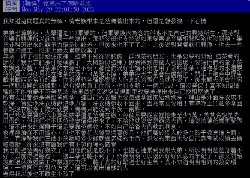 原PO透露,弟弟每個月都會向父母拿5萬元的生活費,但因為擔心斷掉金援後,弟弟會跑到外面亂借錢,故爸爸只能拖著65歲、符合退休年齡的身體,繼續為了弟弟而辛苦工作賺錢。對此,原PO也難過地感嘆,不曉得從小就很聰明的弟弟怎麼會變如此模樣,讓她害怕到不敢生孩子。