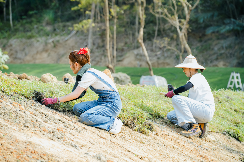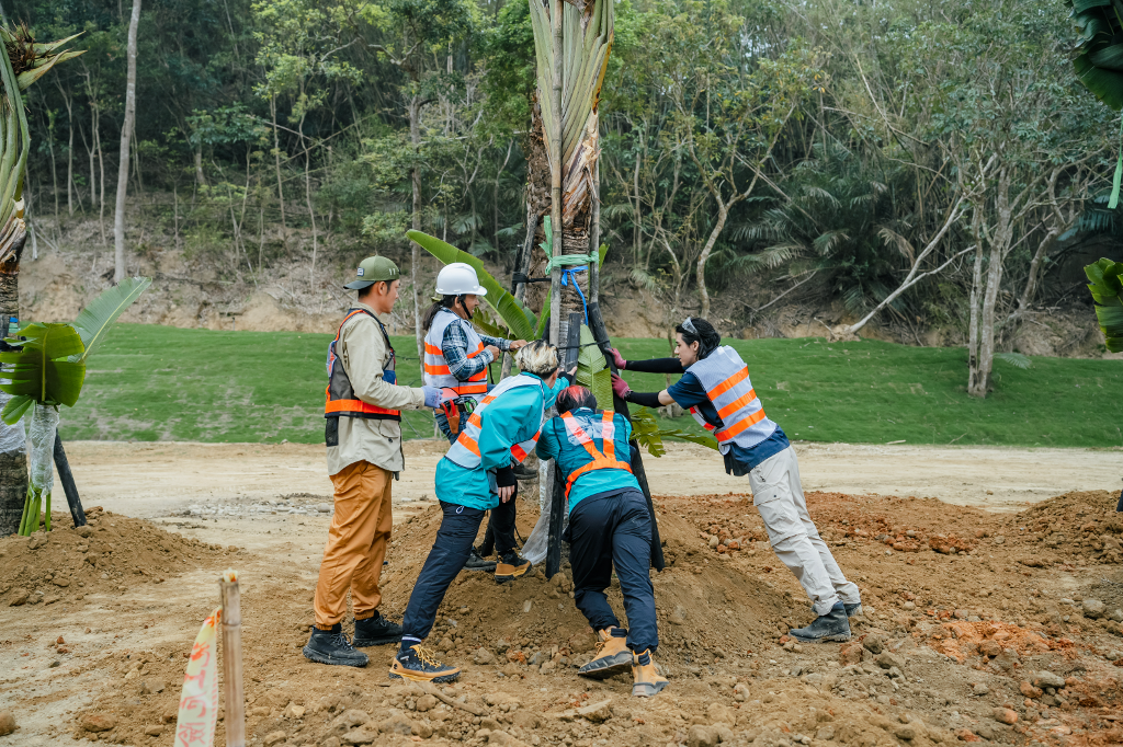 說時遲那時快,大型卡車運來超巨大樹木、幾乎有三層樓高,夥伴們看到目瞪口呆直說:「好大喔!」工班動用大型拖吊車把超巨大樹種在指定的地方,眾人合力把樹豎直,當時日正當中,在烈日曝曬下,體感溫度超過37度,每個人都揮汗如雨。