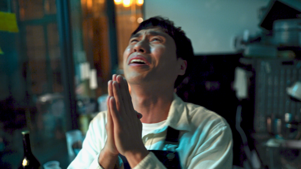 ▲ 楊迦恩在劇中被師父張佑(藍葦華飾)顯靈捉弄嚇到跪地求饒。(圖:公視台語台)