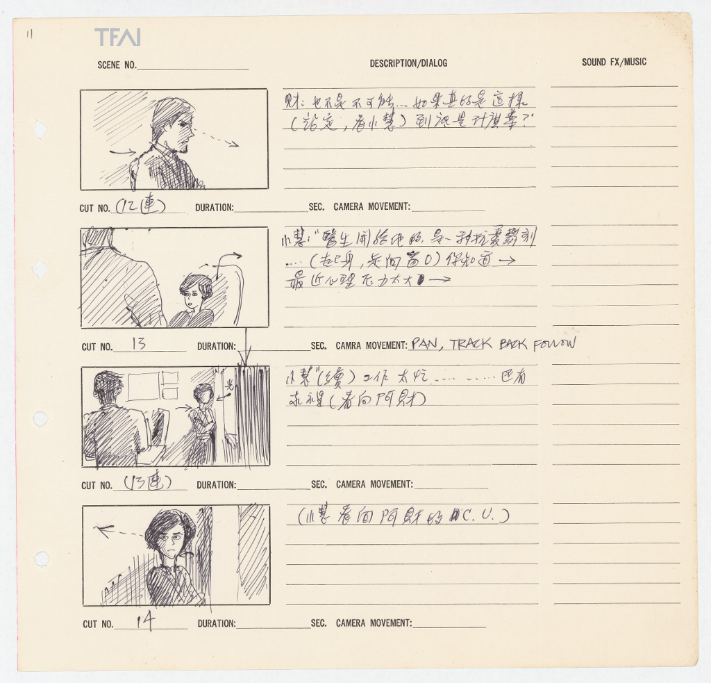▲ 摘自《海灘的一天》分鏡腳本,配角阿財與小慧的對話;除了畫面內容,也註記了楊德昌所想要的運鏡方向、演員視線、光影呈現等。(圖:國家影視聽中心)