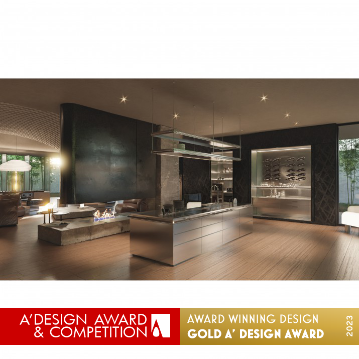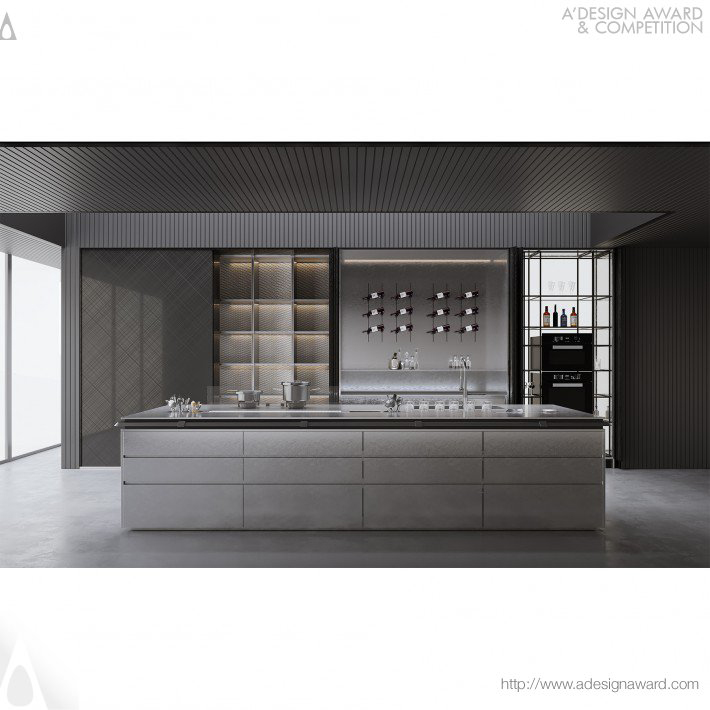 產品融合了竹元素、現代金屬材料和工藝。創新浮雕仿竹編織門板和竹節裝飾架,賦予現代廚房中國風。折疊式側插門和旋轉式側插門設計隱藏了小酒櫃和電器櫃,既美觀又實用。一體式食品級不銹鋼島台提供更便捷的烹飪體驗。