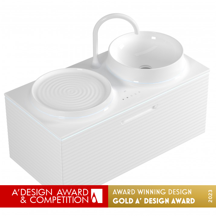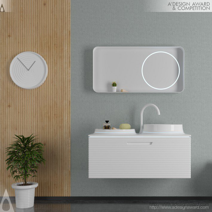 憑藉創新和現代的設計,改變了當前對洗手檯的認知,將浴室與科技融為一體。陶瓷檯面上的電容式感應按鈕可用於調節水龍頭的水量、溫度和流量,以及控制LED照明系統。這些功能可以根據用戶的需求進行客製化設置,並可放置一個洗手槽和一個架子或兩個洗手槽。