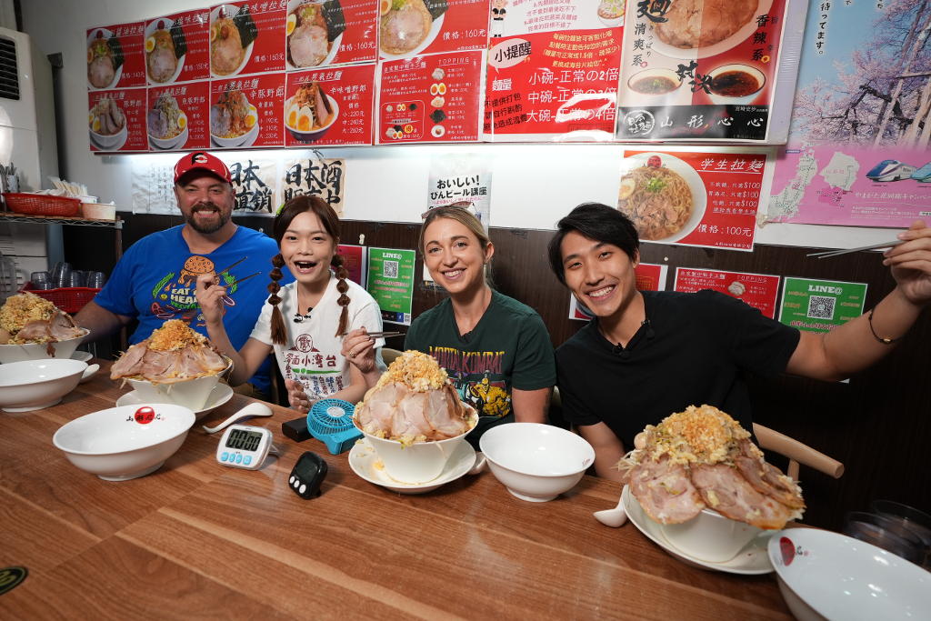 台灣大胃王小慧第一次參加日本《2023火力全開大胃王世界大賽》就晉級8強,還打破大胃王始祖赤坂尊子的6公尺細卷壽司紀錄。此消息一出,也吸引各國大胃王關注!日前新加坡大胃王冠軍Zermatt,和美國百萬大胃王YouTuber Randy跟Katina來台旅遊,特邀小慧一起挑戰3公斤拉麵。這家來自日本的「山形心心拉麵」,主打以大份量為名的二郎系拉麵,特色是超重口味的爆濃豚骨湯底,放上大量叉燒肉和豆芽菜,店內特別標示「小碗是正常量的2倍」,是CP值超高的重量級拉麵。