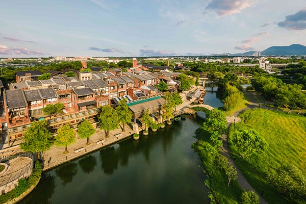 傳藝依傍冬山河而建,其一支流貫穿傳藝,波光水色與懷古建築在此相互映照,營造類似江南的景致。