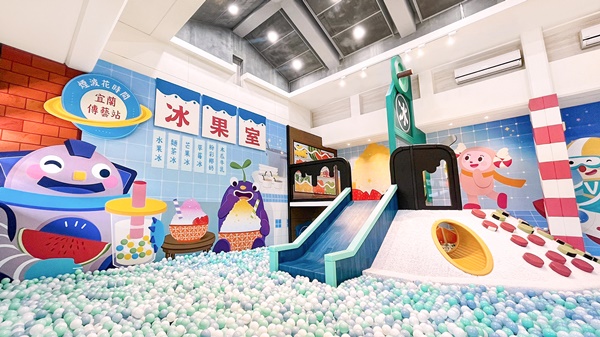 針對親子出遊需求,煙波為房客打造「七淘間」兒童遊戲室,運用傳藝古色古香的印象,延伸懷舊冰果室概念,設計出充滿復古趣味的遊戲室,清涼色系球池、溜滑梯以及牆上的卡樂次元人物,伴孩子開心玩樂!特別設計機關,將球放入通到、按下開關球即灑落,創造剉冰灑下的玩趣!