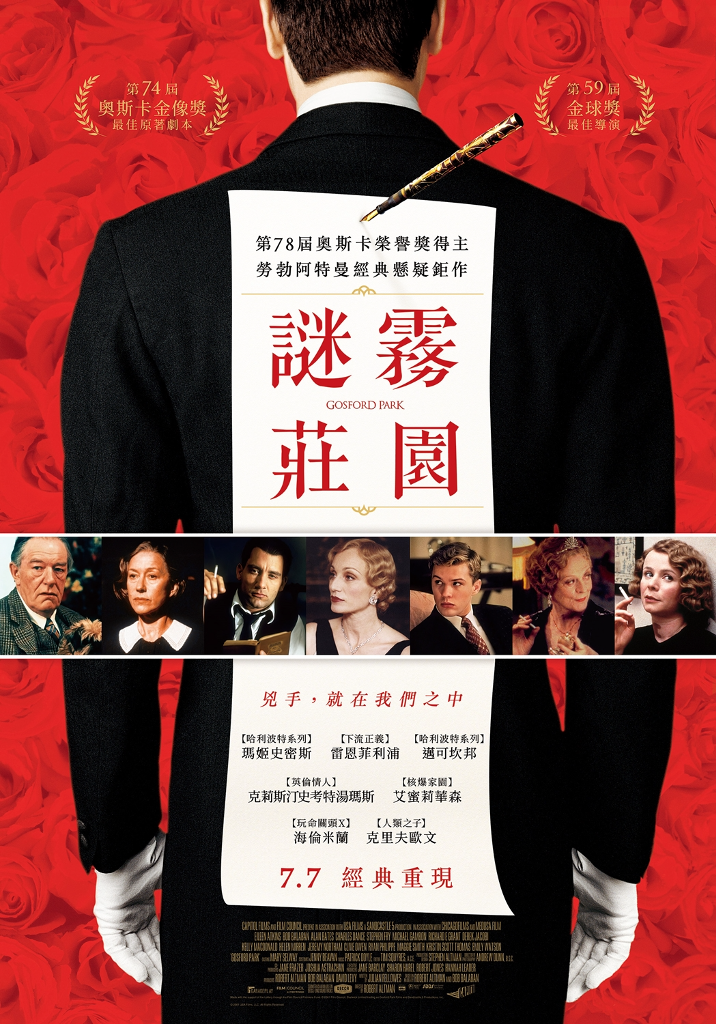 第78屆奧斯卡榮譽獎得主、五度入圍奧斯卡最佳導演的美國名導勞勃阿特曼執導的《謎霧莊園》,故事描述一場豪宅宴會途中發生的殺人事件,是一部向「謀殺天后」阿嘉莎克莉絲蒂(Agatha