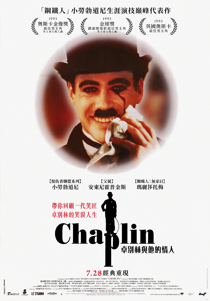 Attenborough)執導的《卓別林與她的情人》,故事描述一代笑匠卓別林的人生,由「鋼鐵人」小勞勃道尼主演,堪稱是他的生涯演技代表作,他因此獲得奧斯卡最佳男主角提名、金球獎戲劇類最佳男主角提名,更拿下英國奧斯卡的影帝寶座!值得一提的是,如今以《蜘蛛人系列》裡「梅嬸」一角聞名的美國女星瑪麗莎托梅(Marisa Tomei),在《卓別林與他的情人》飾演卓別林的御用女主角梅布爾諾曼(Mabel