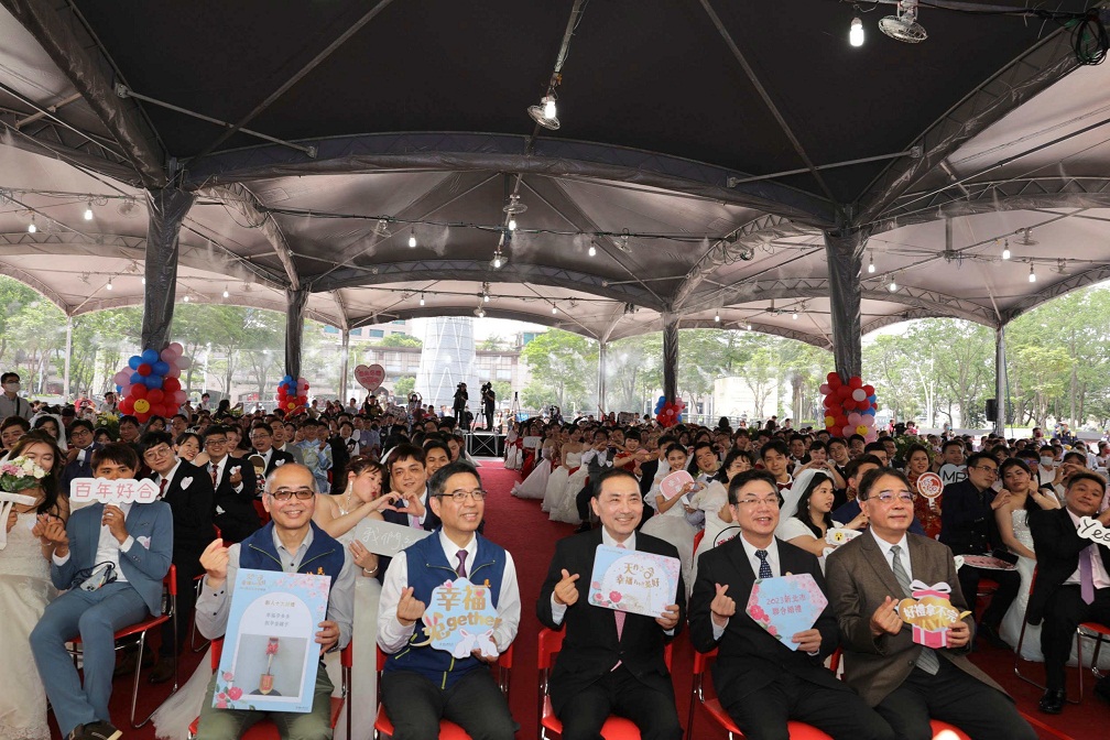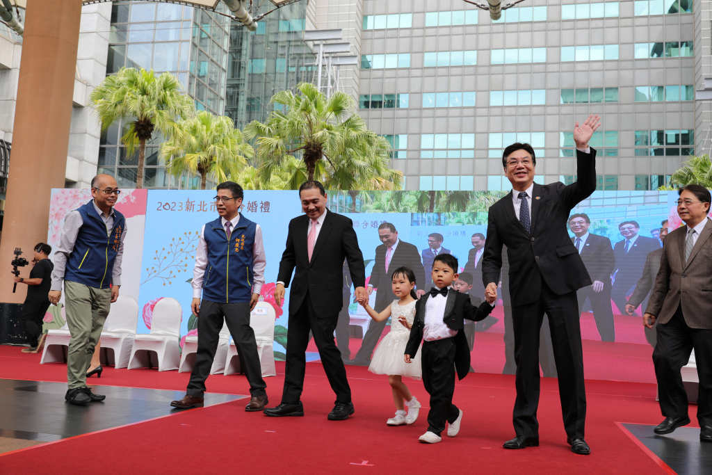 【記者 高金次/新北 報導】2023新北聯合婚禮「天作之合幸福TWO兔好」於(18)日在市民廣場浪漫登場,現場特別以府中雙城為意象,打造新舊交融浪漫氛圍,新人們穿著中式秀禾服、西式婚紗禮服進場,洋溢幸福,市長侯友宜、副市長劉和然擔任證婚人及主婚人,並抽出50項好禮,祝福新人幸福成家。