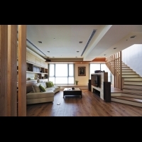 樓梯量體的裝置概念設計:於串連上下樓層的主要軸線─樓梯,設計上不做位置更動,考慮到孩子均已成人,活動上較不受限制,所以摒除調傳統扶手的設計,利用第一、二階與半高主牆結合,之後以格柵線條作為扶手設計,滿足光影與視覺的穿透效果,並將收納機能隱於沙發後方櫃體,放大公共空間的使用坪效。
