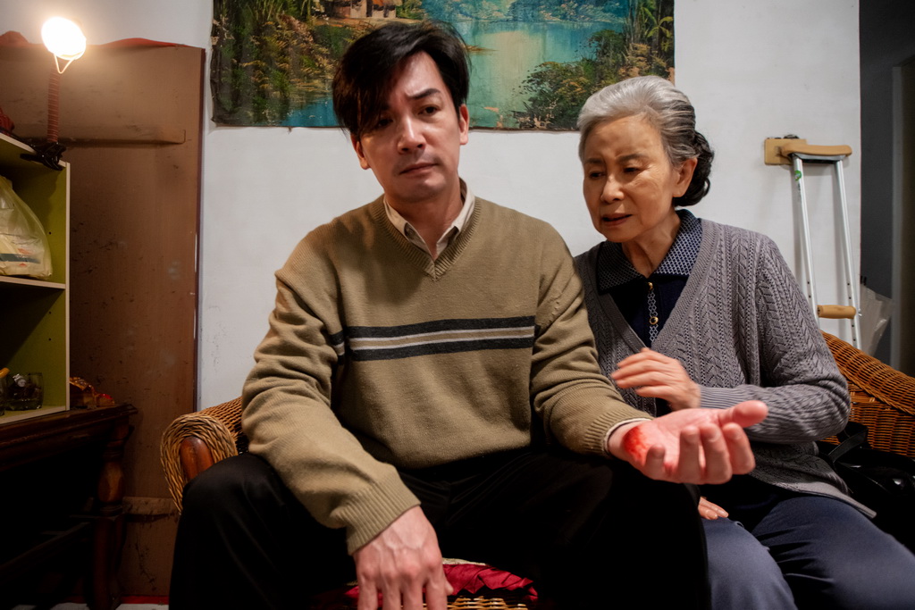 伊正(左)在搜尋者飾演落魄歌手,需要訪視志工(右,林乃華飾)照顧