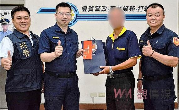 ▲分局長林詔徹頒予司機「老陳」阻詐獎勵禮券及禮品。