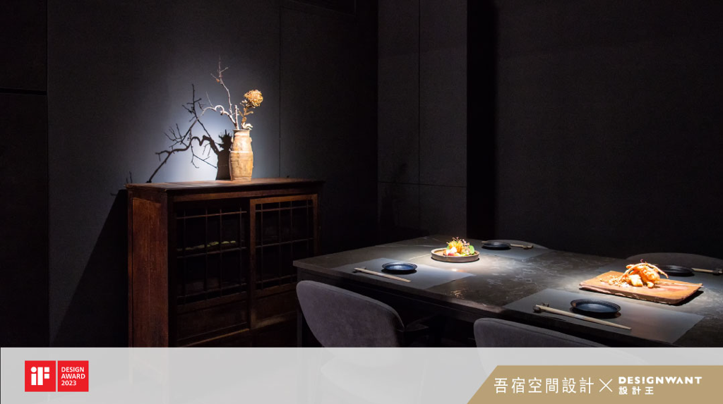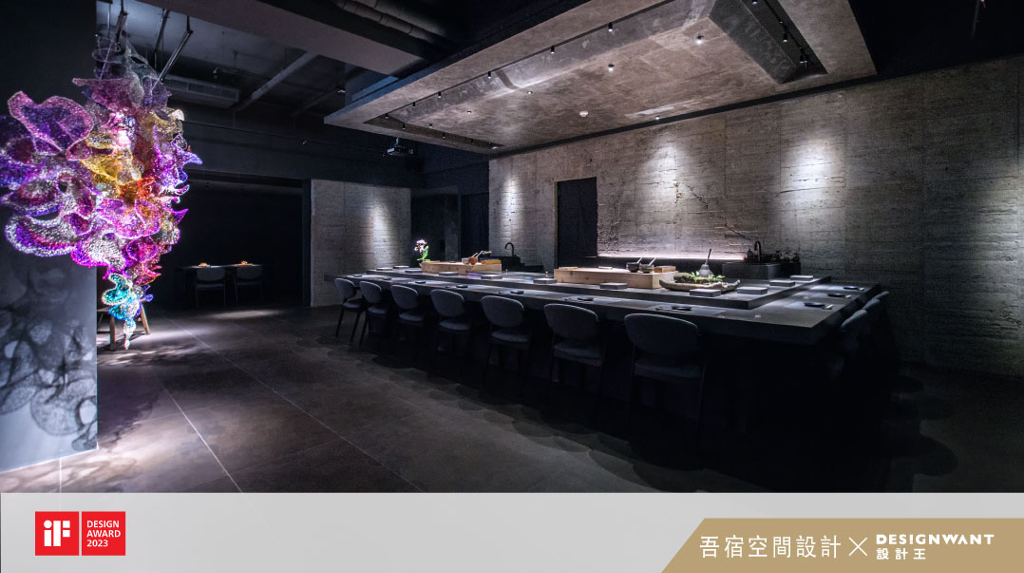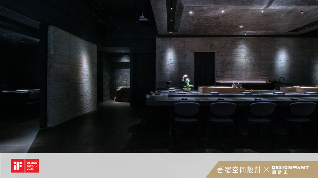 本案為一家日本料理店。業主本身是一名日本料理職人,並且也熱愛蒐集一些老物件及藝術品。因此本案設計師主要設計重點在於將此空間設計成一個能將這些藝術品與業主的料理完美呈現的畫布。結合日本傳統精神與各樣原素打造出有別於傳統日式風格的現代美學日式風格。一進入本案的空間時,有一條延伸至盡頭的廊道。廊道使用沉穩的燒杉建材,讓從喧囂街壤進入到店中用餐的客人能夠有一個轉換與銜接的空間,並同時增加了店內用餐客人的隱密性。長廊的模板牆設計成無置頂、下方兩處鏤空,讓光有效刻畫於長廊中,增加採光度,並同時在大門關上時仍能有通風效果。