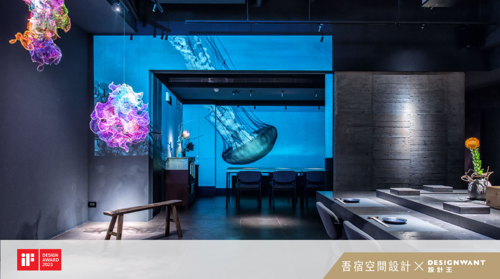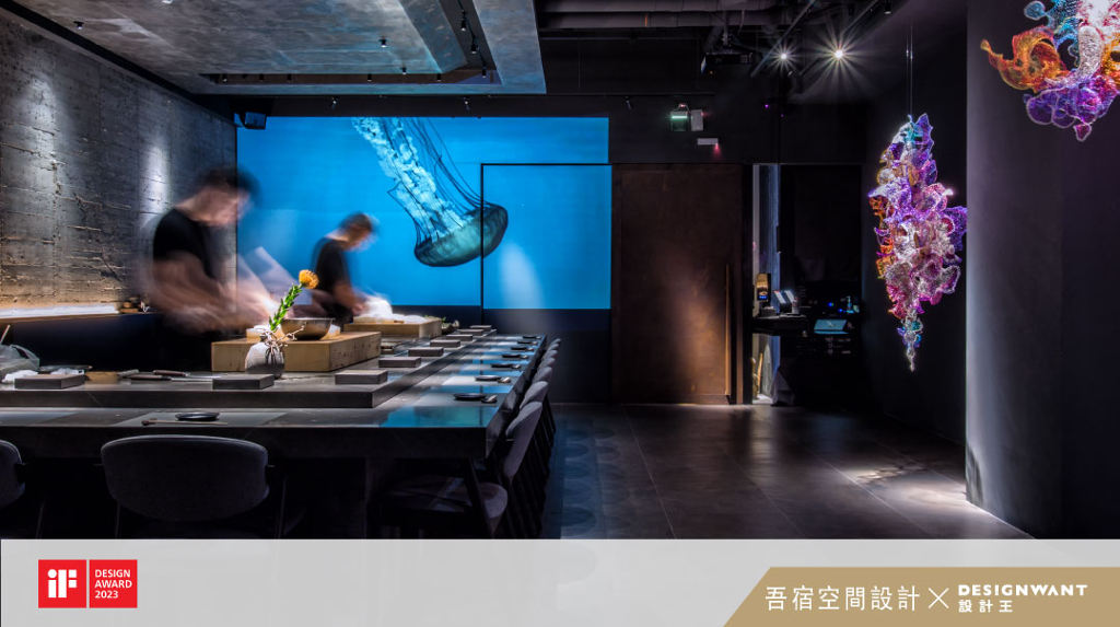 進入到用餐區時,頓時一切都聚焦的很清楚。空間的黑灰色調所帶出的靜謐氛圍,襯托出燈光的方向。燈光所在之處牽引客 人的思緒專注於藝術品與料理上。因著空間色調與燈光的規劃,身處在本案空間時很容易能獲得專注與安全感。而沉靜的氛圍不只來自於視覺上,聽覺也同時扮演著重要的角色。因此設計師特別增加了許多吸音貼以避免聲音於整個空間的擴散及繞射。於板前 (itamae) 後方的藝術品點綴,完美的體現了類似於一片安靜深海中的絢爛物種,雖然艷麗卻仍然無聲,只剩水中波瀾的聲音迴盪。此藝術品也是為了呼應業主新鮮的食材。