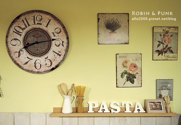 簡單僕實的歐式鄉村風格,鵝黃色的色調真的讓人看了心情很舒服放鬆~旁邊還有放著義大利麵和擀麵棍,還蠻喜歡這種元素的!