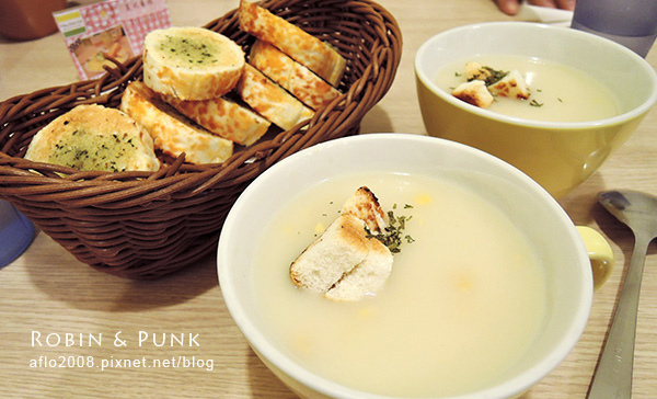 軟式起司法國麵包外皮烤的酥脆但咬下後裡面是軟Q的,再塗上自製青醬,真的相香獨特好吃,而且也可以再沾上玉米濃湯吃,別有一翻風味!