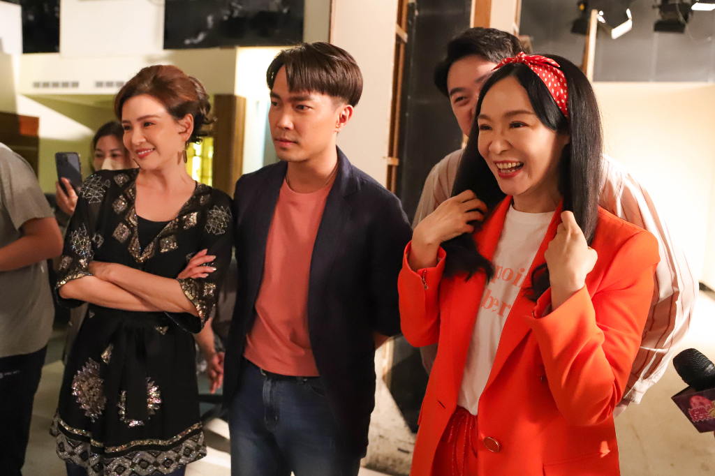▲ 徐薇老師帶兒子大成來民視8點檔《市井豪門》攝影棚,開心和胡嘉愛跟許仁杰合影。(圖:民視)