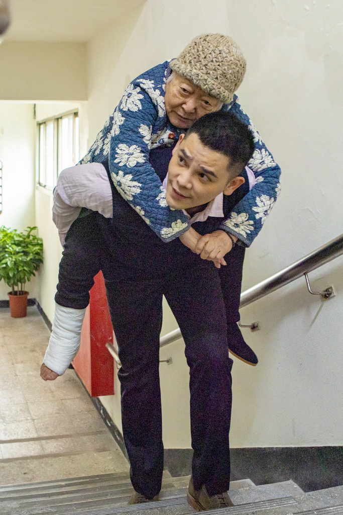劉引商《搜尋者》劇中出院後,由里幹事(盧學叡飾演)揹、接送回家(圖:大愛電視提供 黃華安攝影)