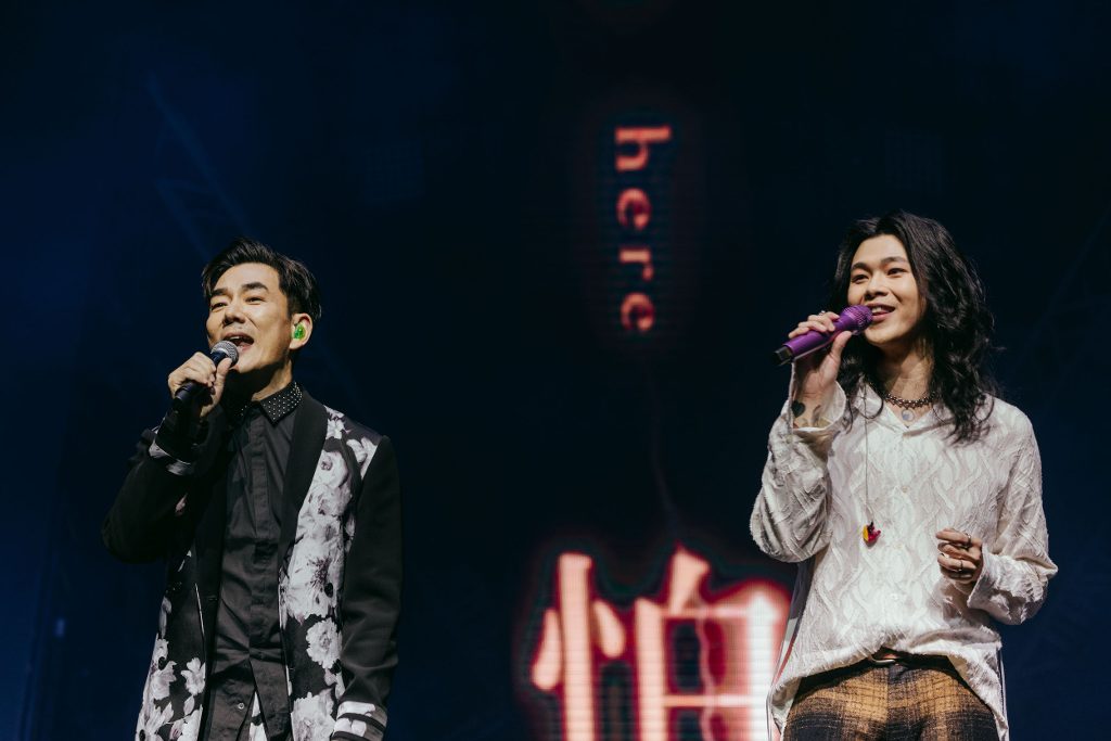 ▲ 當〈對面的女孩看過來〉前奏響起,任賢齊與主唱聖皓也跳起經典舞蹈,並且搞笑改編歌詞,令全場笑聲不斷。(圖:相信音樂)