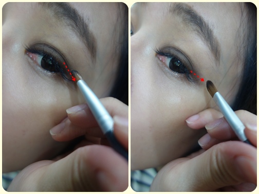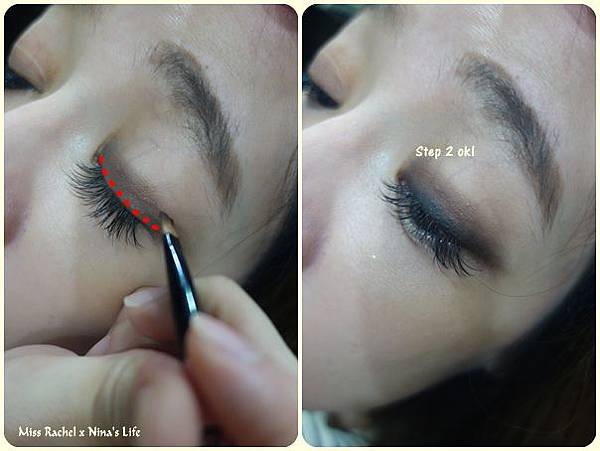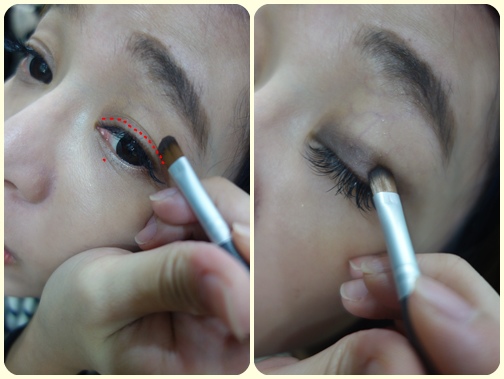 Step1.直接用中間色,刷在眼褶的地方,畫到眼尾的部分後可以稍微往後延伸