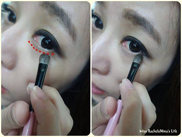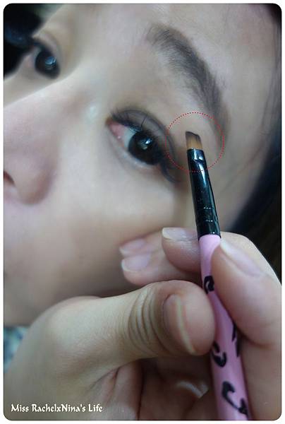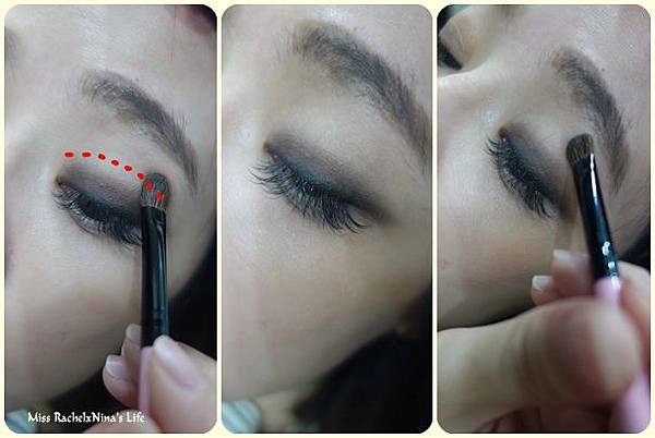Step2.用最右邊最深帶點bling bling的顏色,這時候可以用像這種”斜角刷”,刷在眼線的地方